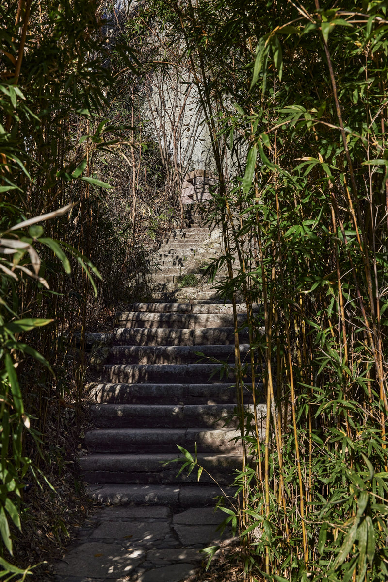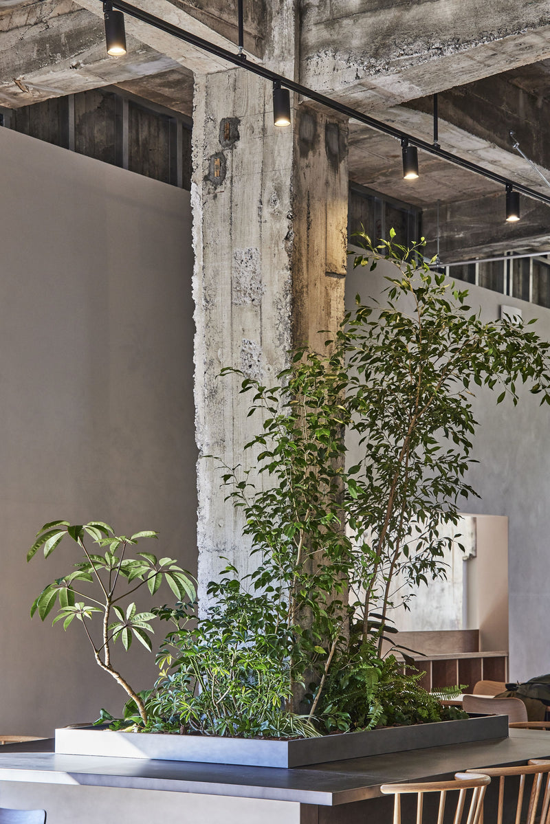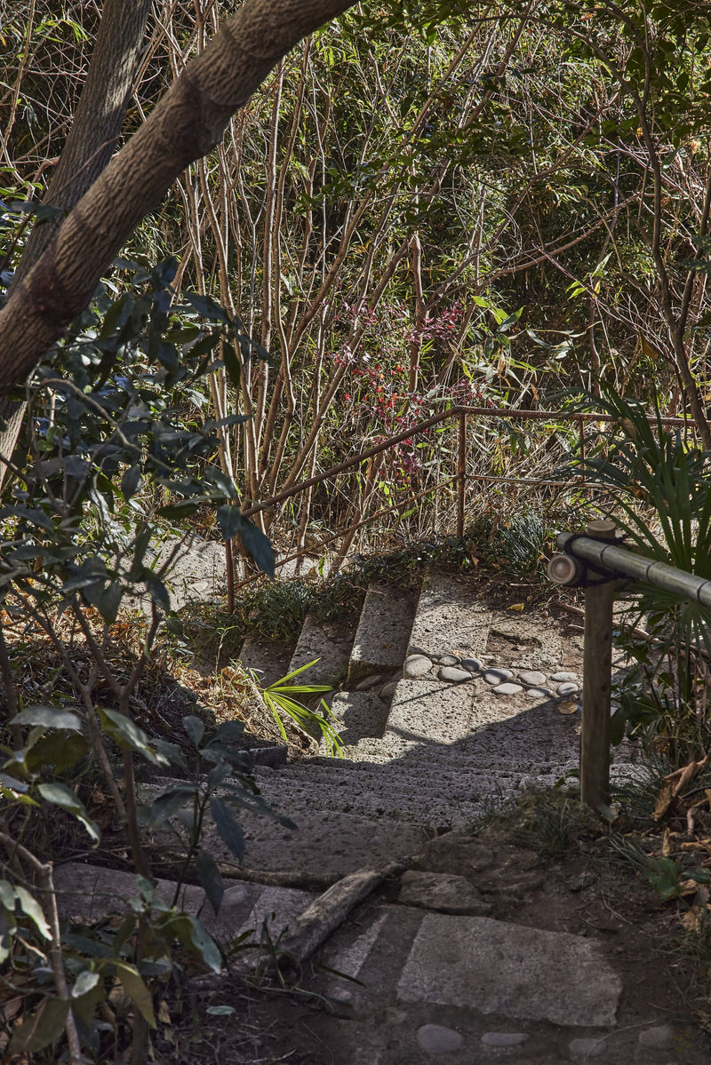 まず、遺跡を発掘するかのように、生かせるものを露出させていった。現時点でのこの場所の植生は、葛や藤やアケビなどの蔓植物が全体を覆っている。おそらくどこかのタイミングで、茂ってきた樹々を伐採したため、光が入り、蔓性の植物がはびこったのだと思われる。これらの植物の勢力を落ち着かせていくためには、クヌギやアオダモなどの、落葉の陽樹が骨格となる森をここから時間をかけて育てていかなければならない。しかし地面は大谷石の岩板。植木屋さんの畑で育った木を植えても思うように成長しないので、藪や、草むらから生える実生の樹々をできる限り残す事を意識した。樹々が大きくなり影ができると徐々に蔓性の植物達が絶えていくだろう。人が自然に寄り添い手を入れれば、場が徐々に安定していく。