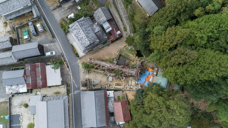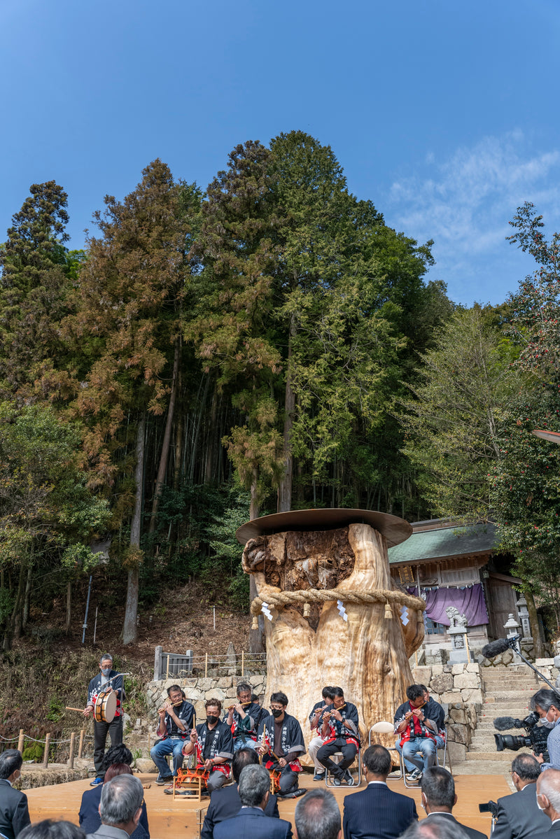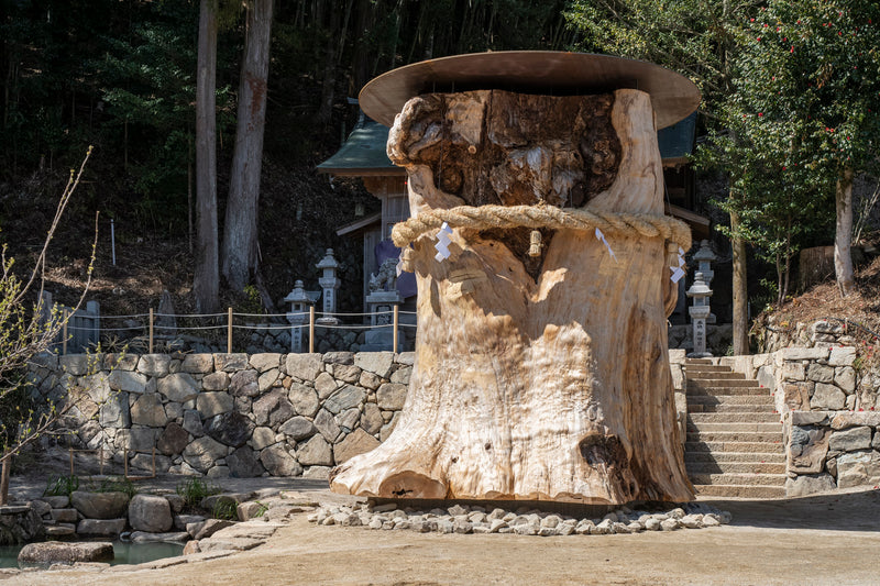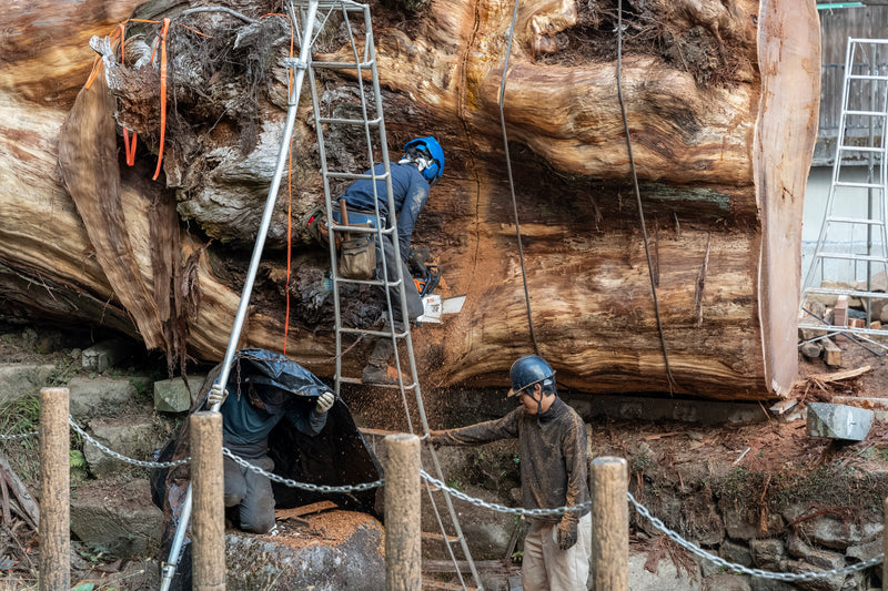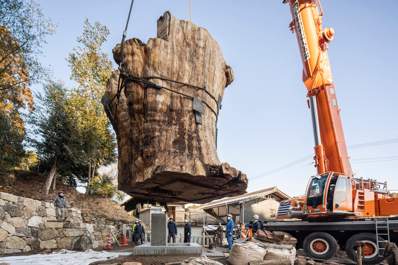 Shinmei-Shrine Osugi, which stood in Okute-Cho along the Nakasendo trail, suddenly has fallen. The fallen cedar had been the symbol and spiritual anchor of the townspeople. An open-bidding competition was carried out to preserve the irreplaceable, and we participated as a team.