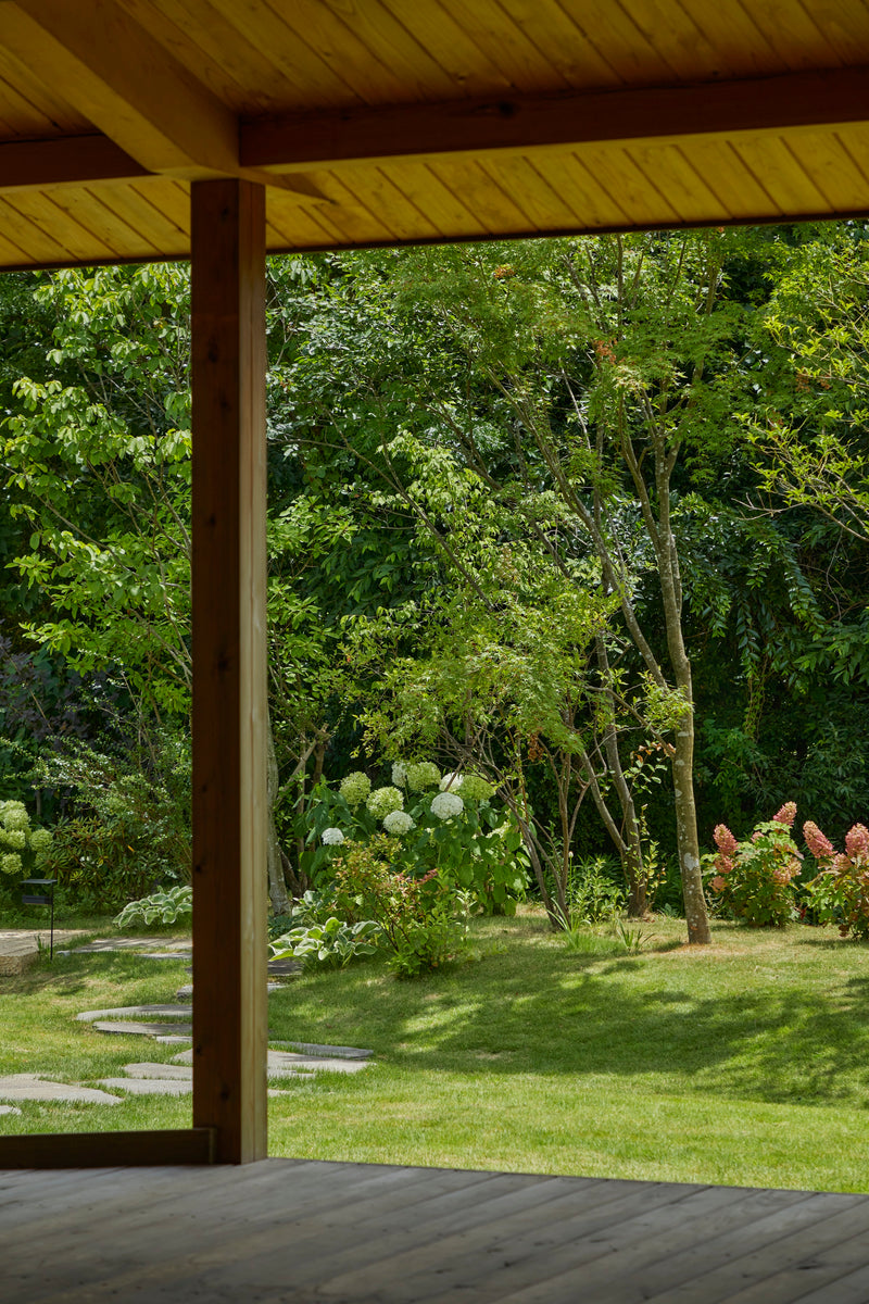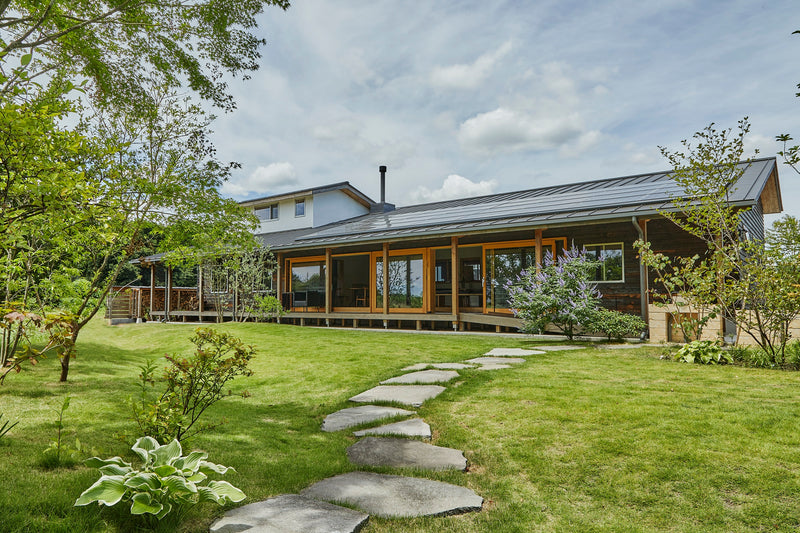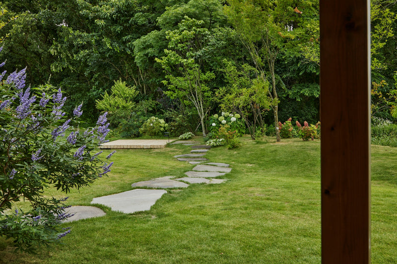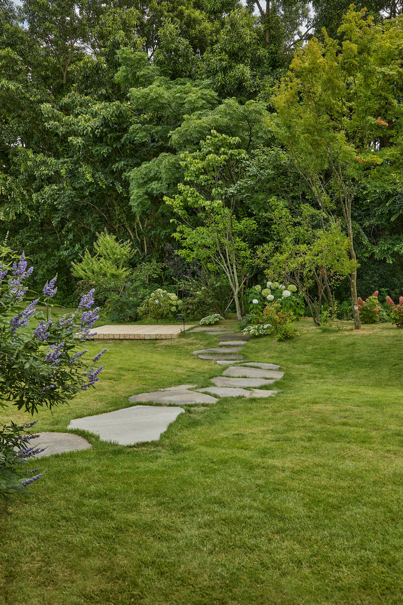 We created an inviting approach to the house with the stonework in the center of the land, and placed a wood storage and a compost on the west side as the boundary. We added undulations to the large grassy area to prevent monotony, and also paid attention to the underground environment.
