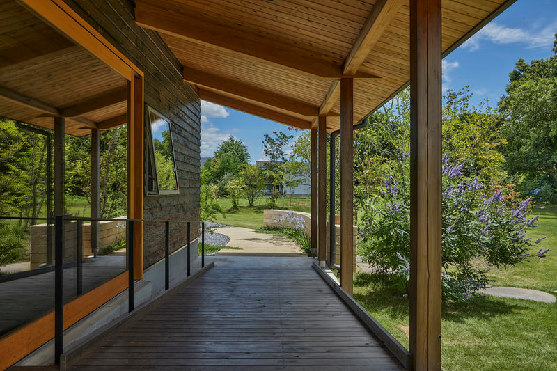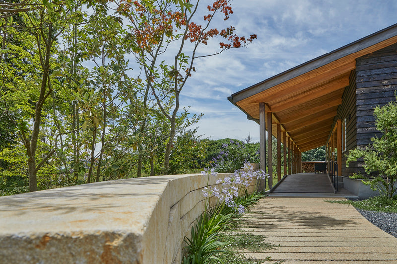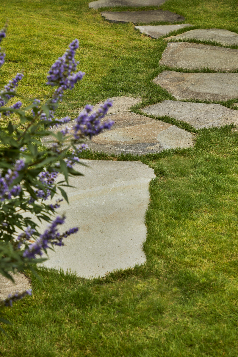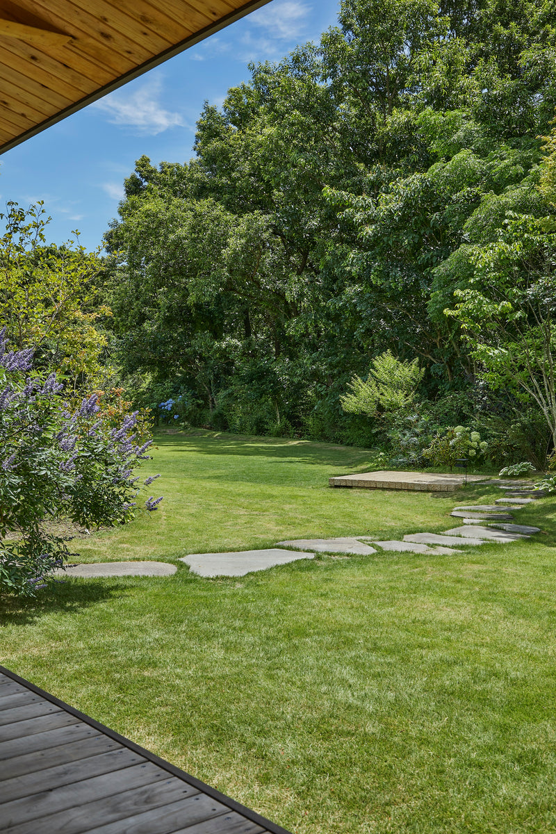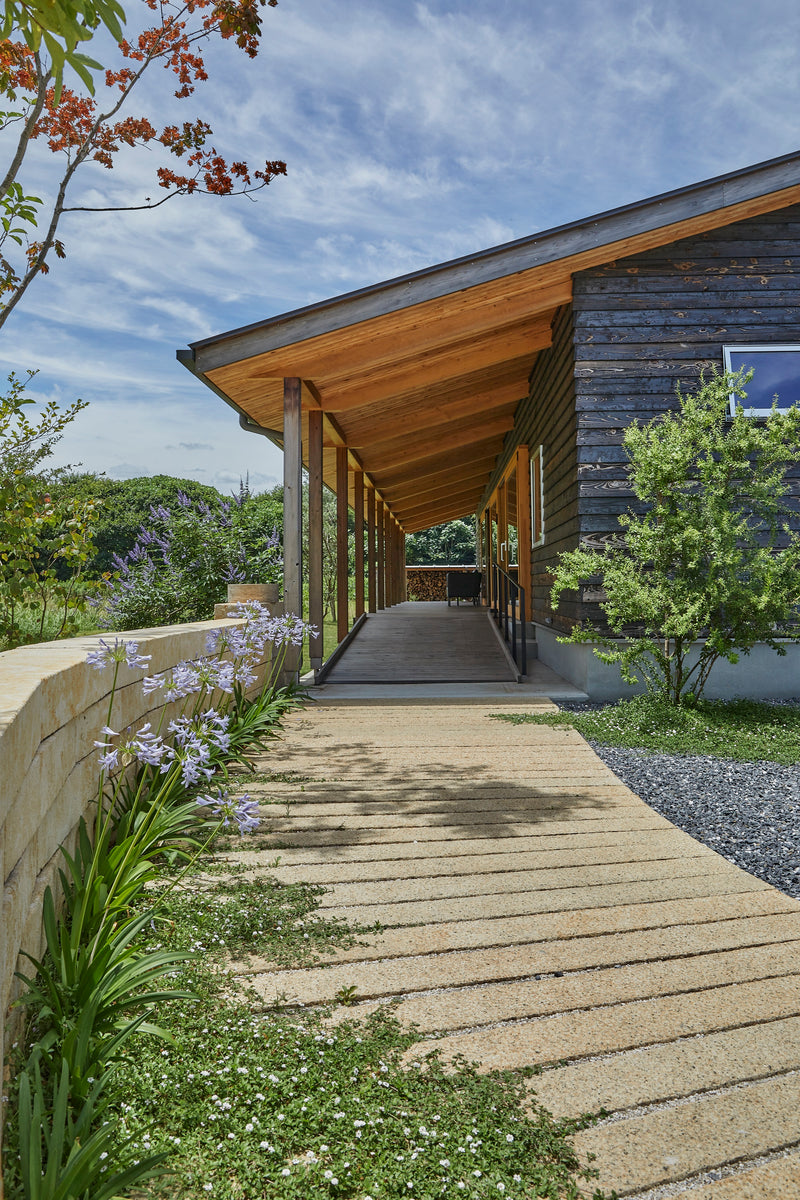 We created an inviting approach to the house with the stonework in the center of the land, and placed a wood storage and a compost on the west side as the boundary. We added undulations to the large grassy area to prevent monotony, and also paid attention to the underground environment.