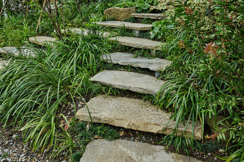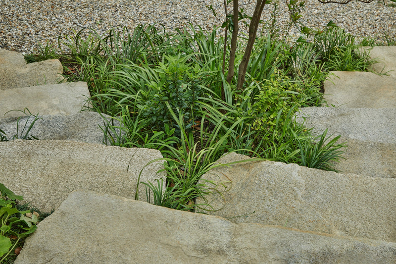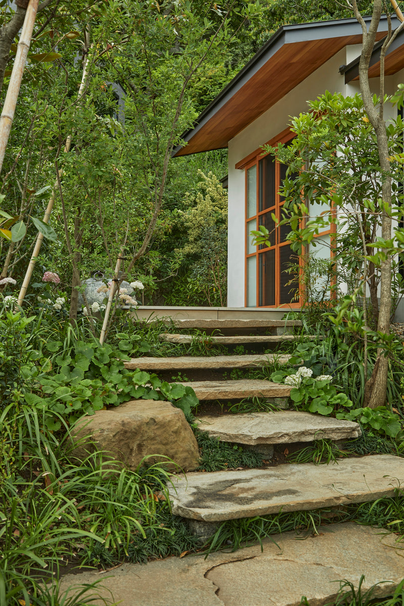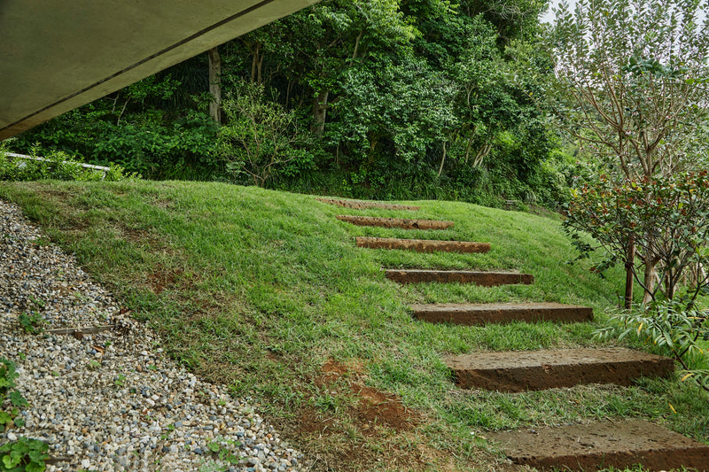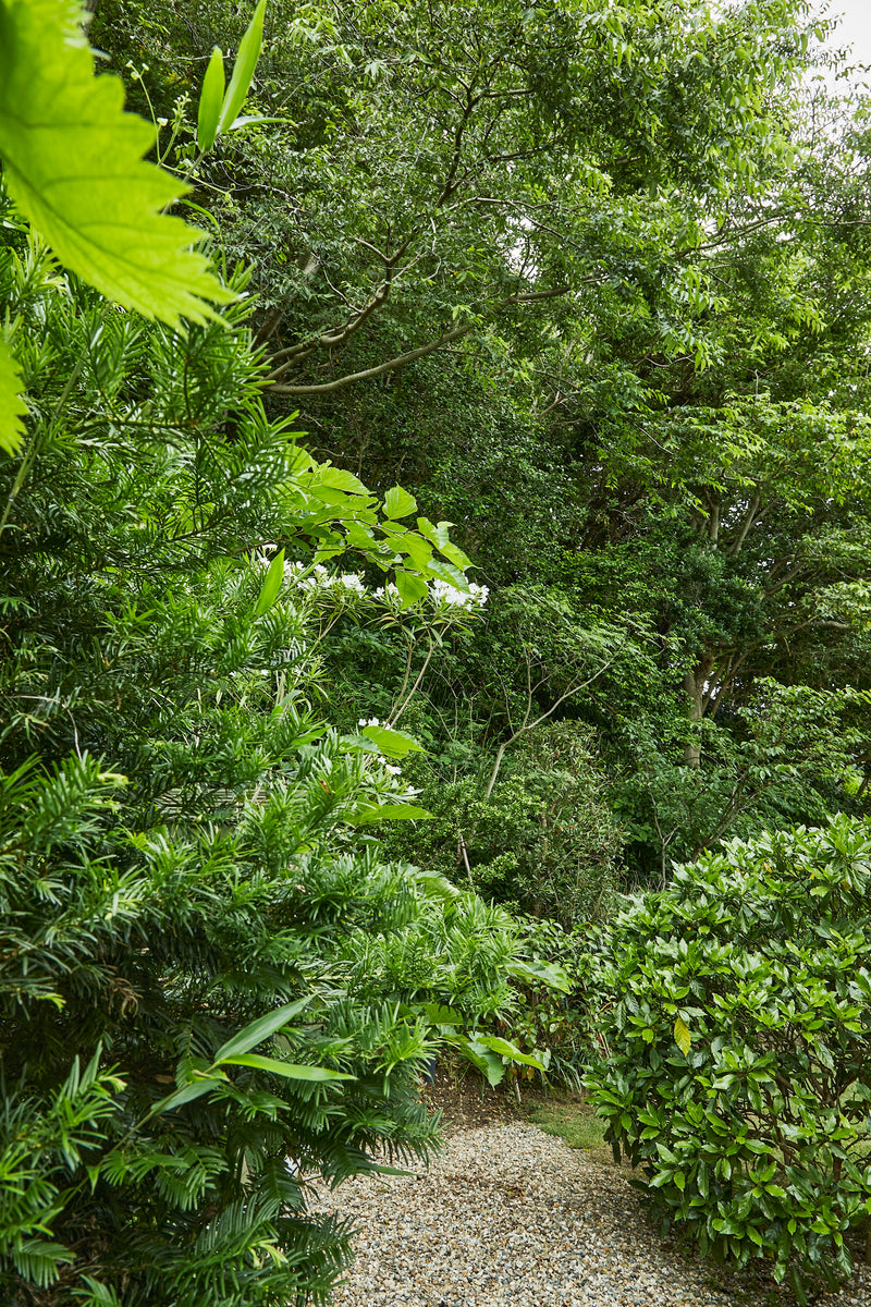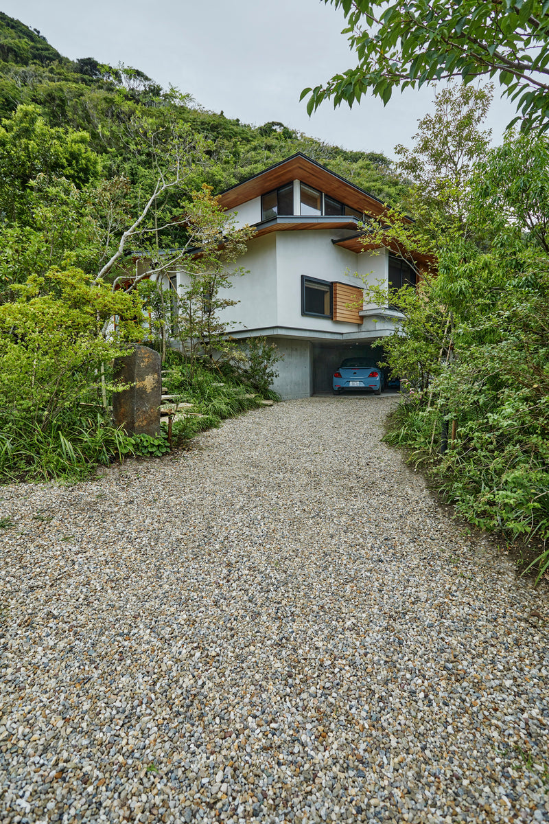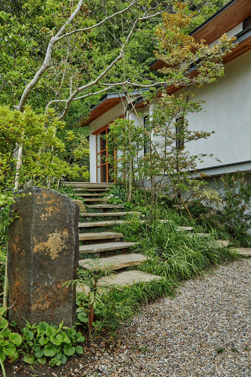 In the front garden, which has a 3m difference in elevation from the entrance to the house, you will be greeted by salt-resistant trees that bloom with flowers throughout the seasons. At the base of the garden, we planted Japanese orchids that spread out like an ocean on the mountain behind the house, carefully connecting the scenery to the ocean of Japanese orchids on the mountain behind the house.