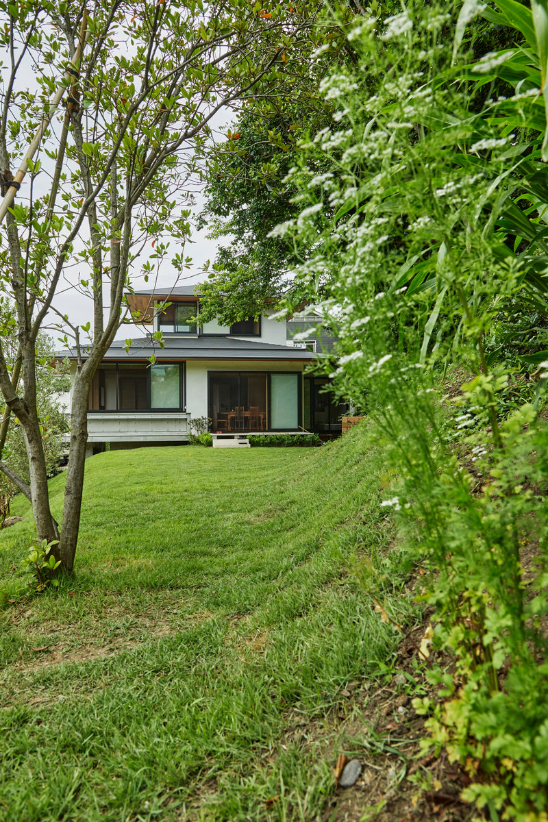 When you go through the dining room from the room, you will see the backyard. A rare flat surface on the hillside was created and made into a space for the residents to enjoy. Fruit-bearing plants were planted on the slope, and a field space and compost were set up at the furthest point from the building.