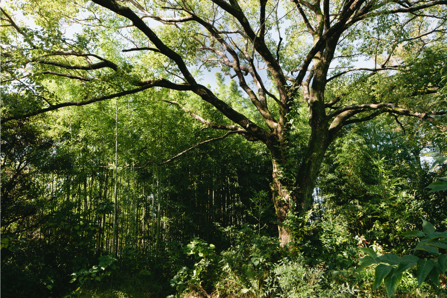 In this garden, two big camphor trees and a bamboo grove have been handed down from generation to generation. Basking the dappled sunlight, myoga-ginger, fuki (Japanese butterbur), dokudami, and kumasasa-bamboo cover the ground. Along the pathway of neighboring plots, there is a tea hedge. Fruit trees such as citrus fruits are planted along the field.